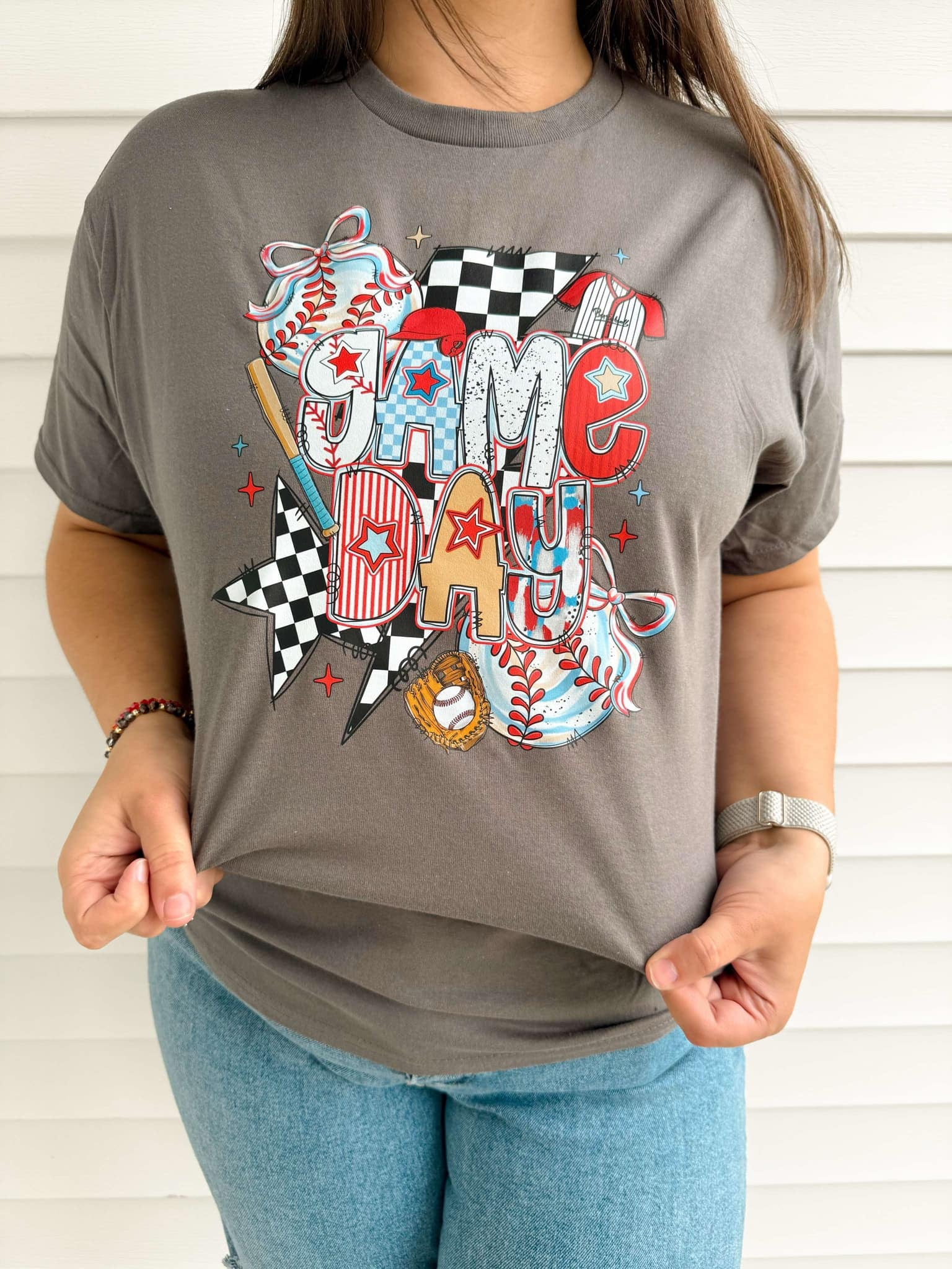 This fun and sporty tee brings all the vibes with bold colors, baseball details, and comfy style—perfect for cheering in the stands or running the bases of life.